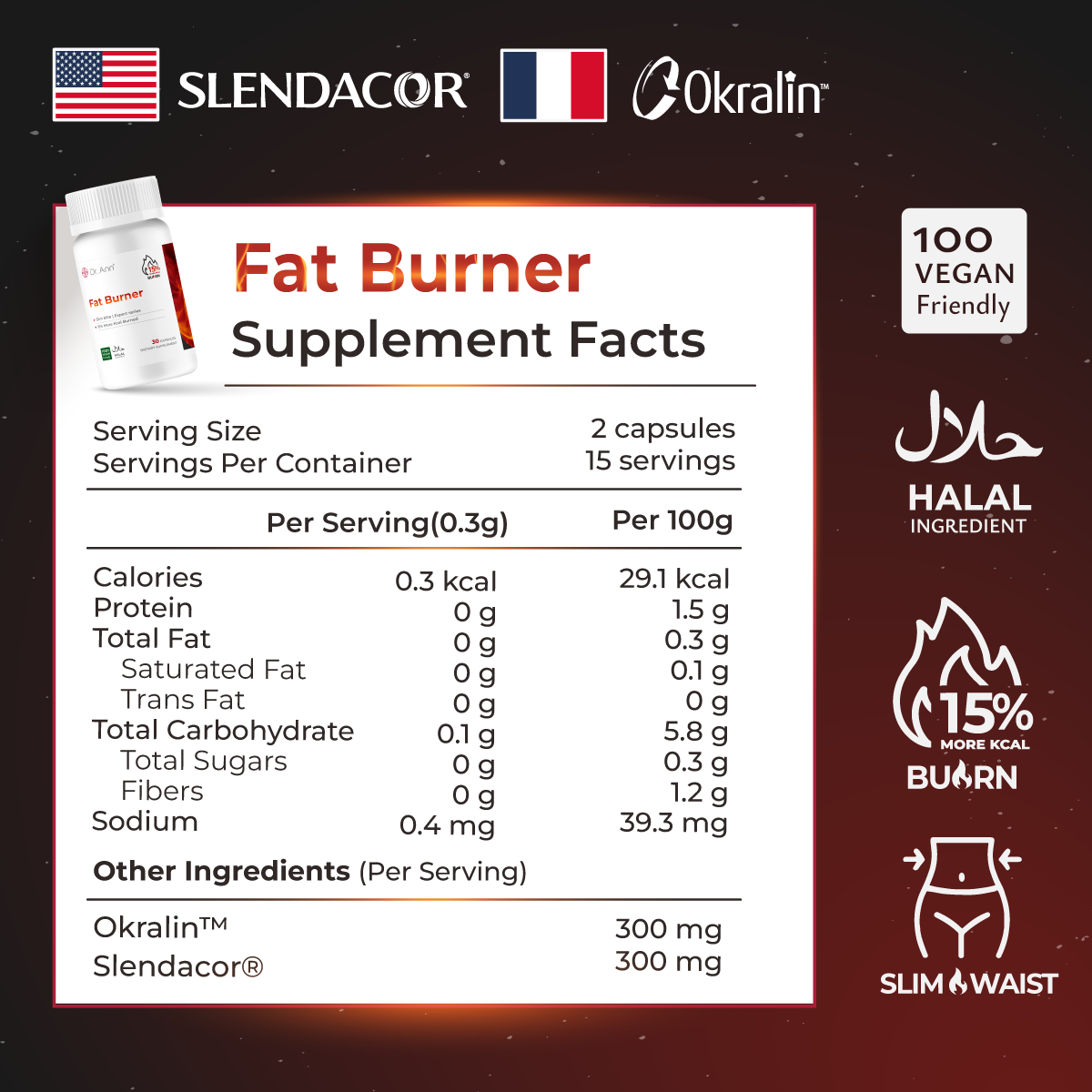 Introducing Dr. Ann’s Fat Burner, a scientifically formulated supplement combining two powerful ingredients—Slendacor® and Okralin®—to support your weight management journey without the need for strict diets or intense workouts.