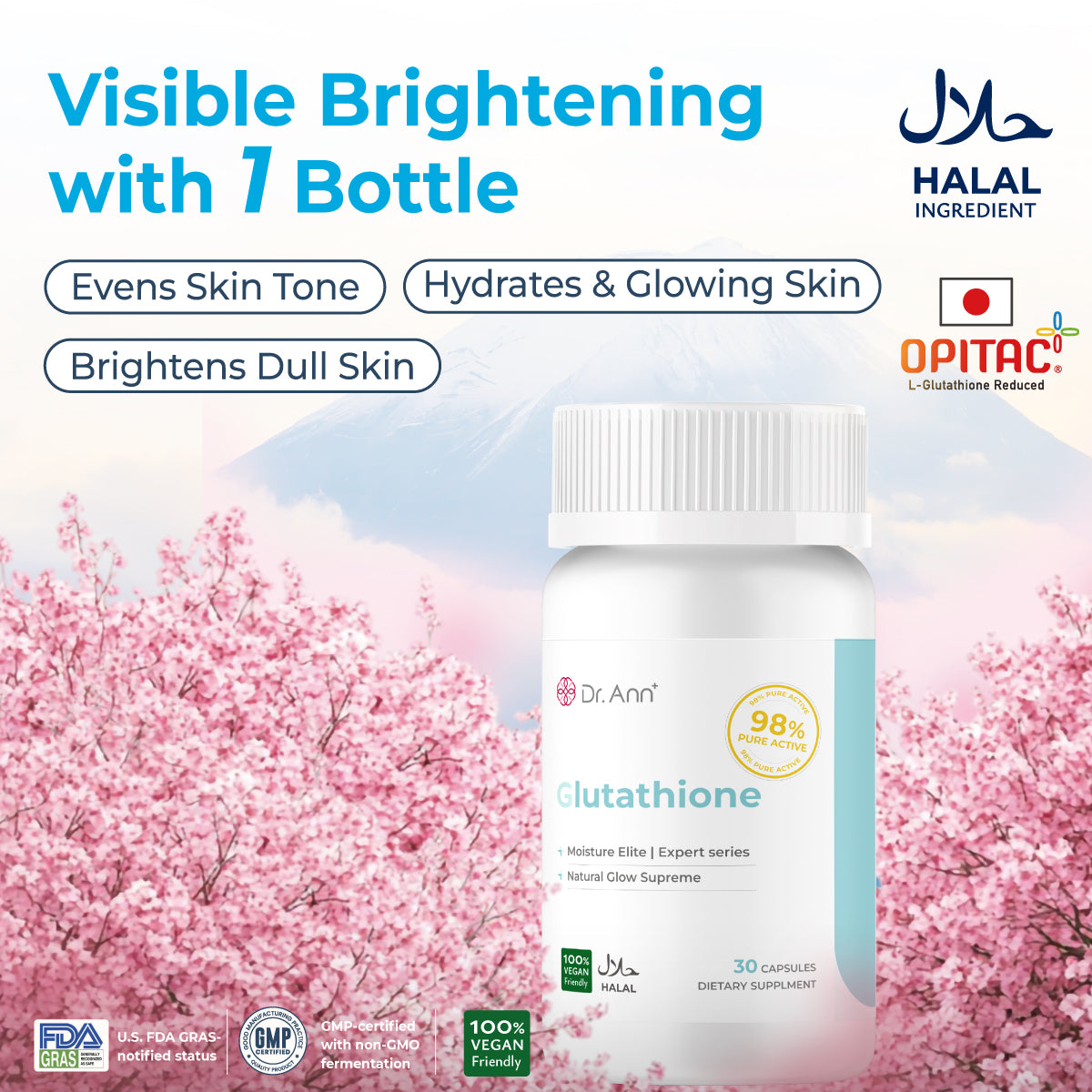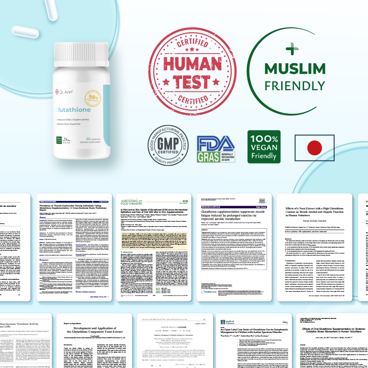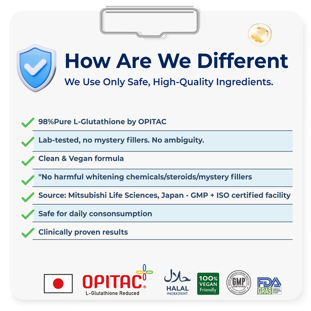 Our glutathione, sourced from Mitsubishi Life Sciences, is the only one in the world utilizing a high-concentration, non-GMO circular yeast extraction process. It is also the only TFDA-approved glutathione for use