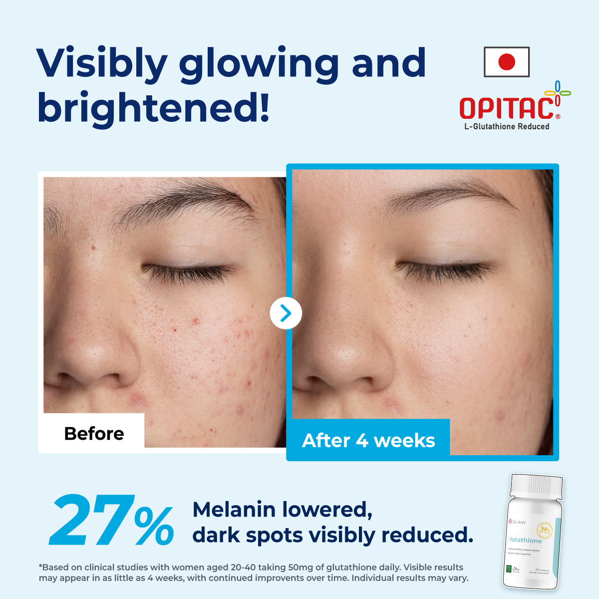 Fast Absorption: Blood glutathione levels rise within 60-120 minutes after intake. Boosted Antioxidant Power: When taken with Vitamin C, antioxidant effects increase by up to 23% (patented in Japan & Taiwan).