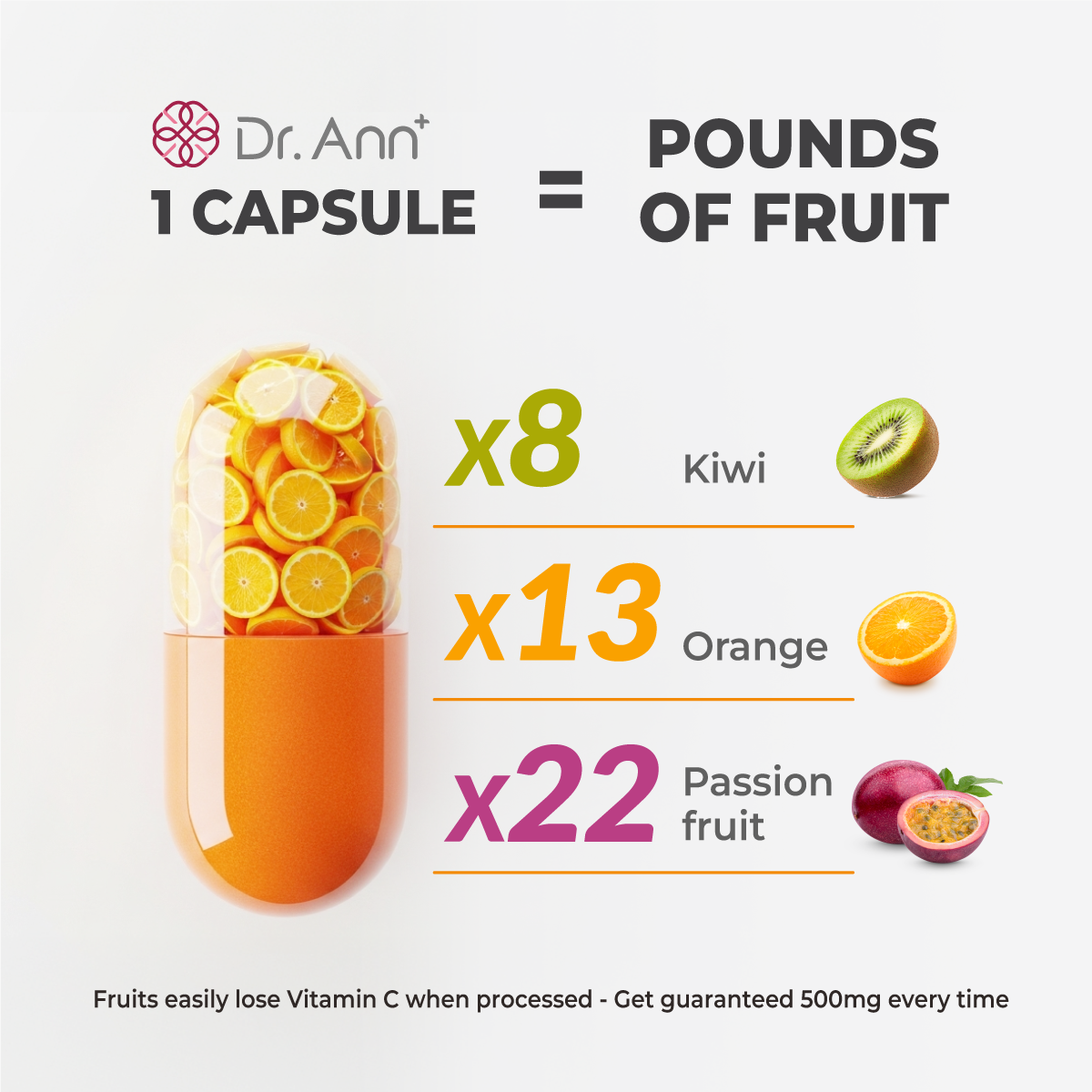 18.Fruit Potency Equivalent: One capsule provides a Vitamin C equivalent to the amount found in 8 kiwis, 13 oranges, or 22 passion fruits.